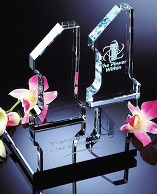 - Optical Crystal "1" is an ideal award when someone or something has achieved the right to be named number "1". Self-standing or can be mounted on a black glass base. Price includes etching logo on one surface. Packaged in presentation box or gift box. 5" W x 5 3/8" H x 4" D